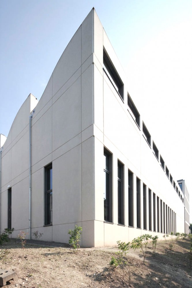 Riegel, Gelenk und Halle bilden ein Ensemble mit durchgängiger Architektur- und Materialsprache. In sachlich und ästhetisch der Aufgabe angemessener Weise wird mittels Betonfertigteilen eine klare Fassadenstruktur aufgebaut, welche sich bewusst am benachbarten Hochschulgebäude UMIC orientiert, ohne dieses zu kopieren. Die Funktionen der einzelnen Gebäudeteile werden hierbei deutlich ablesbar: Das engmaschige Öffnungsraster des Riegels reagiert auf die Labor- und Büronutzungen, die großflächigeren Strukturen der Halle zitierten mit dem archetypischen Sheddach Bilder aus dem Industriebau. Hierbei verweist die wellenförmige Ausbilder der Sheds auf die Gebäudenutzung
