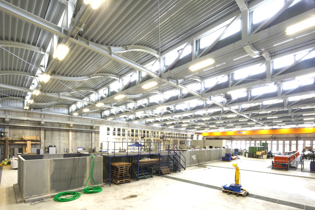 Die klare, unverwinkelte Halle ermöglicht es, sämtliche Bereiche effektiv mit einer gemeinsamen Kranbahn anzubinden. Die Vorrüstfläche ist funktionsoptimiert zwischen die beiden Versuchsfelder geschaltet, der unter der Vorrüstfläche positionierte Tiefbehälter ist mittels Rinnen an beide Felder angebunden. Das unter Bezugnahme auf die Nutzung wellenförmig ausgebildete, nord-west-ausgerichtete Sheddach belichtet – vor Einblicken geschützt und abdunkelbar – gleichmäßig die gesamte Hallenfläche. Das Versuchsfeld 2 mit seinen festen Einbauten ist bewusst als „Schaufenster zur Stadt“ ausgebildet, kann aber bei Bedarf mittels Sichtschutzlamellen jederzeit vor Einblicken geschützt werden.
