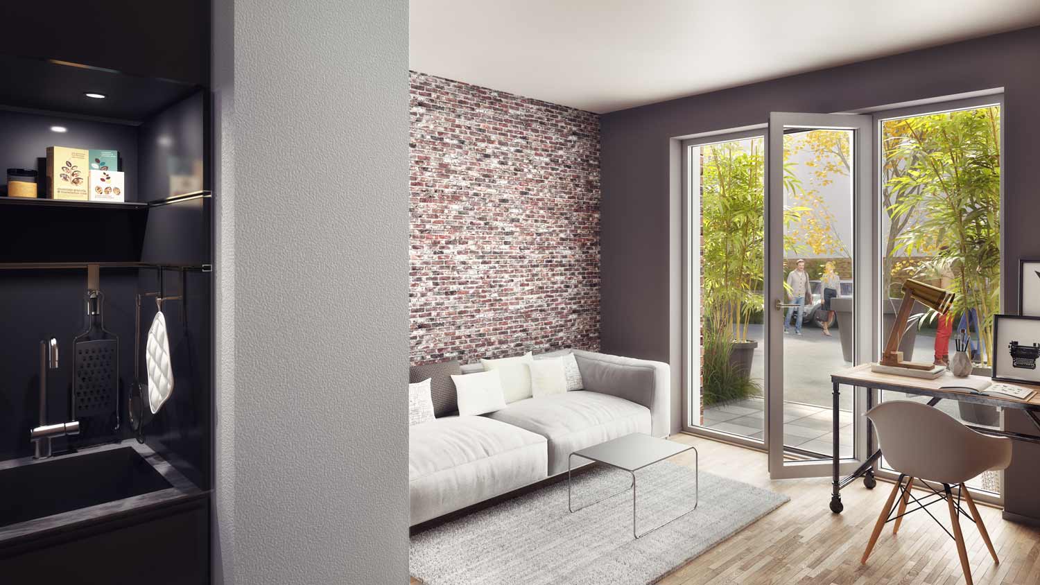 Zum einen bietet das Projekt alle Vorteile des Lebens in zentraler Lage, zum anderen entsteht durch den Innenhof ein geschützter Raum, der Ruhe und Geborgenheit gewährt. Unterstützt wird der besondere Charakter des Innenhofs durch Materialien wie Klinker und Stahl einerseits und die Begrünung durch große Pflanzenkübel andererseits.