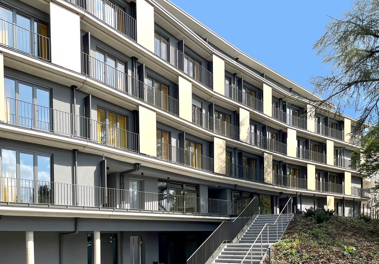 Der Charakter der Umgebung mit der großzügigen Bewaldung am Fuße des Lousbergs wird durch diese Formgebung sowie durch die zurückhaltend gestaltete Fassade mit einer deutlich horizontalen Gliederung und gedeckter Farbgebung unterstrichen.