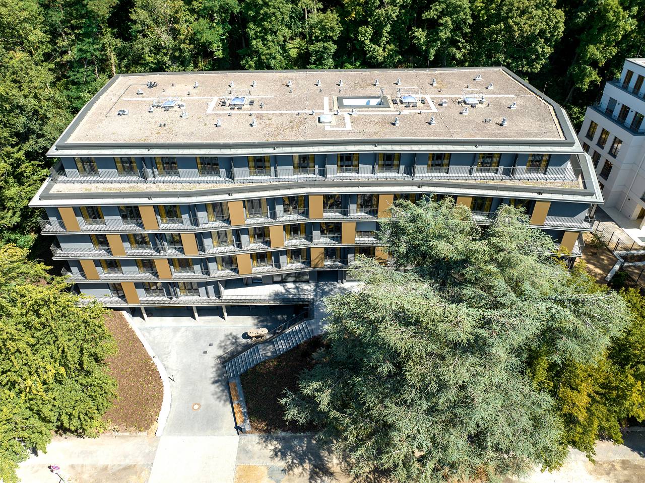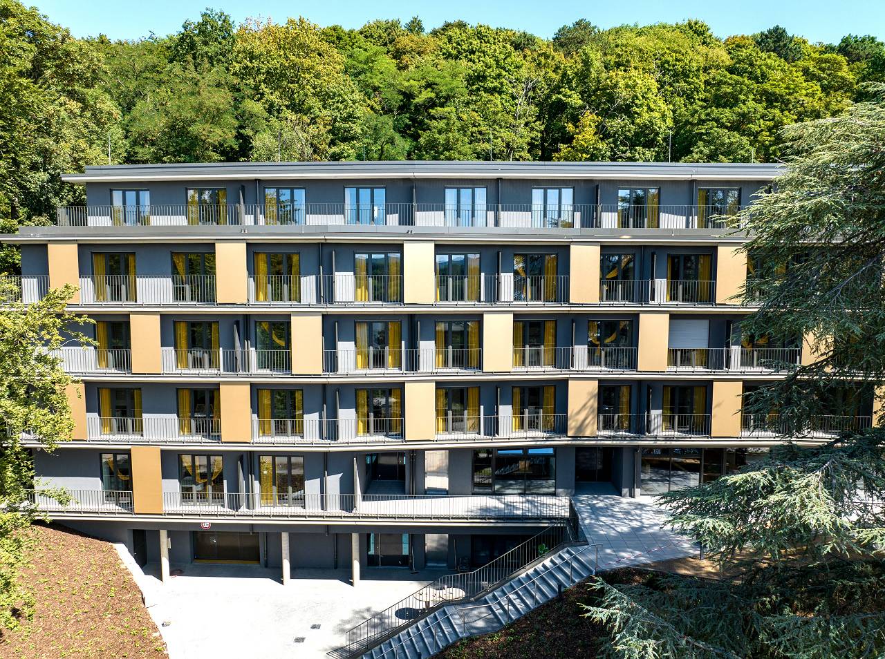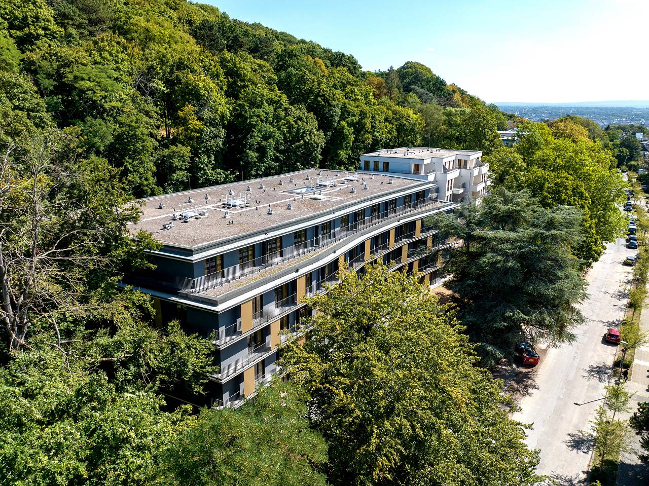 Das geplante Gebäude orientiert sich bezüglich seiner Abmessungen und Geschossigkeit an den Nachbarbebauungen Nizzaallee 20-46 sowie den durch den dichten Baumbestand gegebenen bebaubaren Flächen des Grundstückes. Es wurden fünf Geschosse geplant, wobei das fünfte Geschoss zur Straße sowie zur Nachbarbebauung deutlich zurückgestuft ist.