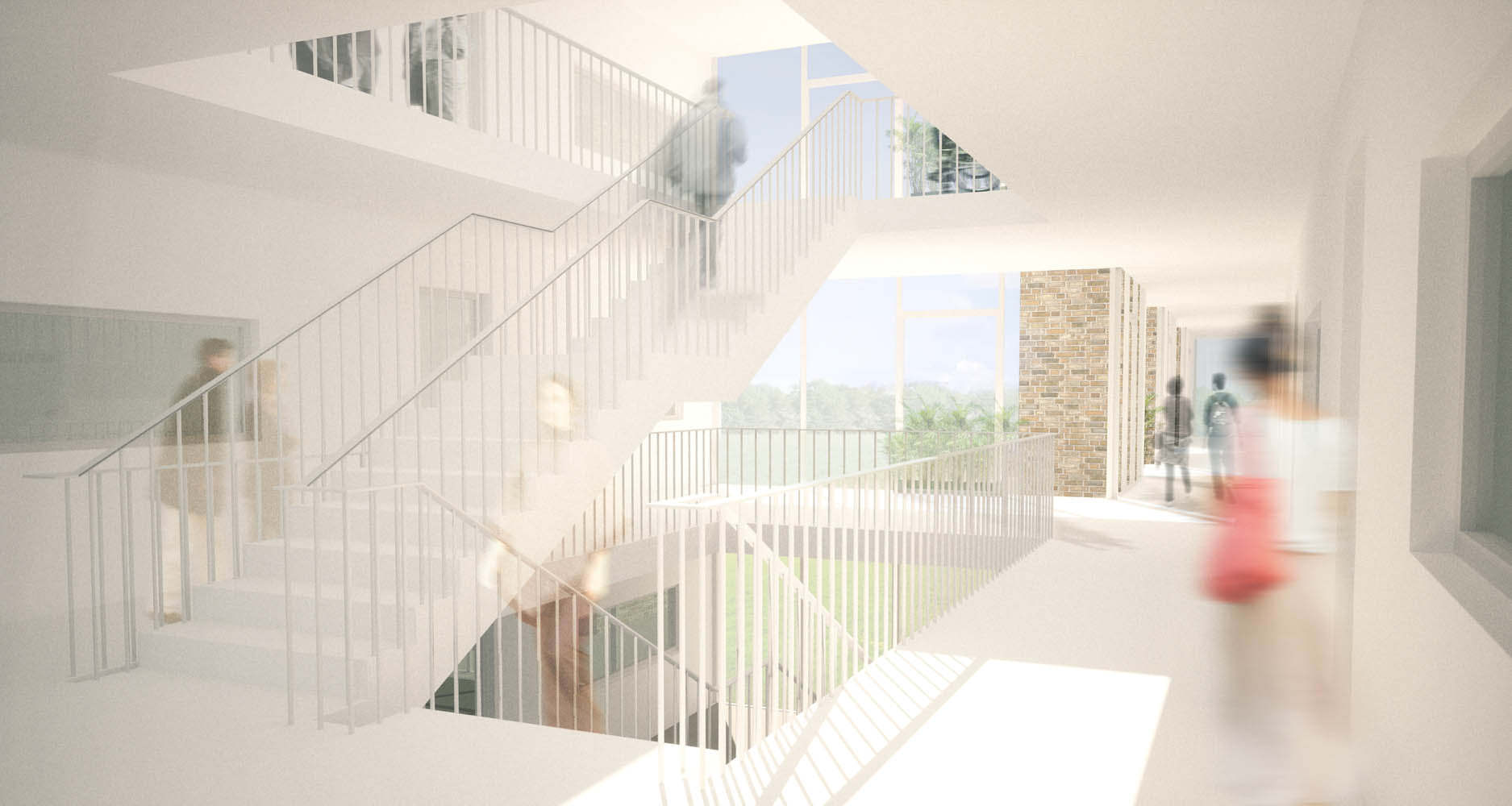 Die klare innere Organisation lässt sich an der äußeren Struktur ablesen. Das zentrale Treppenhaus – vom Haupteingang sowie von der Parklandschaft aus sichtbar – bildet einen lichtdurchfluteten Raum mit vielfältigen Blickbeziehungen, der zum Verweilen und gegenseitigen Austausch einlädt. Diese hohe Qualität des Erschließungsraums setzt sich in den Wohnungsfluren fort, die natürlich belichtet sind und den Blick in das Hofgelände freigeben. Kleine Sitznischen laden auch dort zum Verweilen ein und machen den Erschließungsraum zum Aufenthaltsraum. Gleichzeitig erlauben die Wohnungsflure eine natürliche Belichtung der zum Flur orientierten Küchenräume der Appartements. Die Schrägstellung der offenen Fassadenteile und Loggien schafft einerseits eine optimale Belichtung der Innenräume und andererseits eine adäquate Privatheit gegenüber den Nachbarwohnungen. Gleichzeitig gibt die Ausrichtung der Öffnungen den Blick Richtung Park vor.