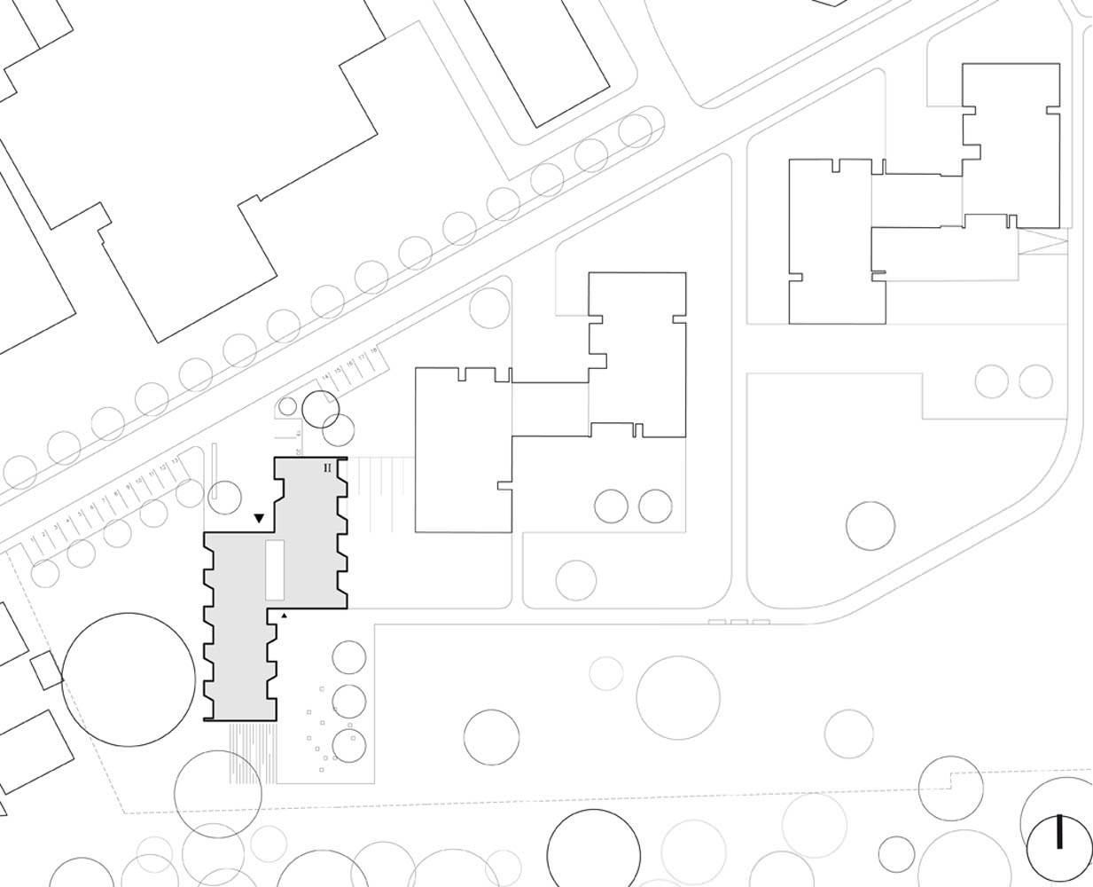 Die städtebauliche Organisation des Benediktushofs gibt den Rahmen für die Neuplanung vor. Auf dem westlich gelegenen Grundstück nimmt das neue Appartementhaus die städtebauliche Form und Orientierung der beiden Wohngruppenhäuser Haus Elisabeth und Haus Bernardus auf. Gleichzeitig bildet der Neubau einen städtebaulichen Abschluss des Benediktushofs gegenüber der westlich angrenzenden Wohnbebauung. Der zweigeschossige Baukörper zeichnet sich durch eine klare Struktur aus, ohne die Umgebung zu dominieren. Zur Straße “Am Kloster” markiert ein kleiner Vorplatz den Haupteingang. Das Untergeschoss schafft eine interne rollstuhlgerechte Verbindung zwischen dem Eingangsniveau und der tiefer gelegenen Parklandschaft. Die großkronigen Bäume bleiben erhalten.