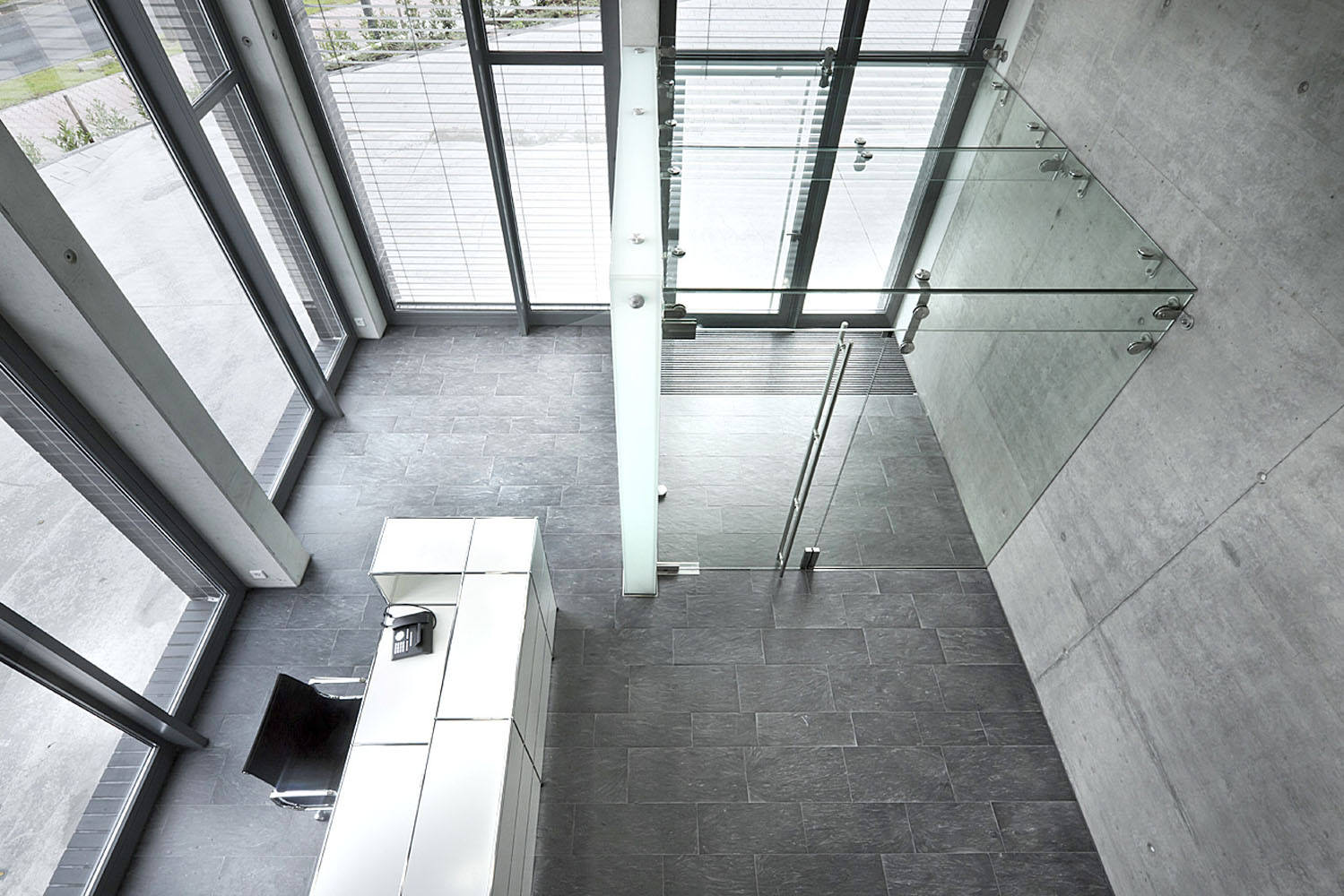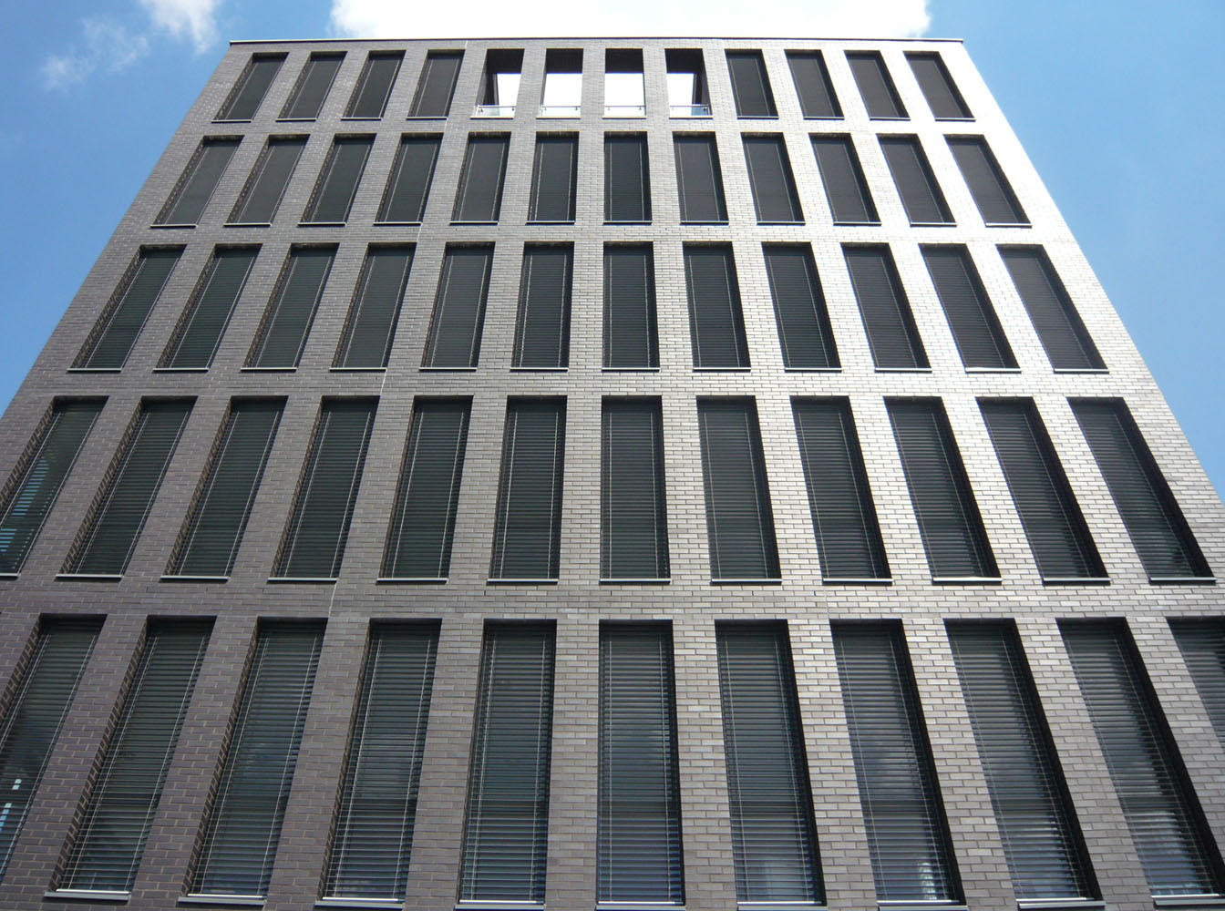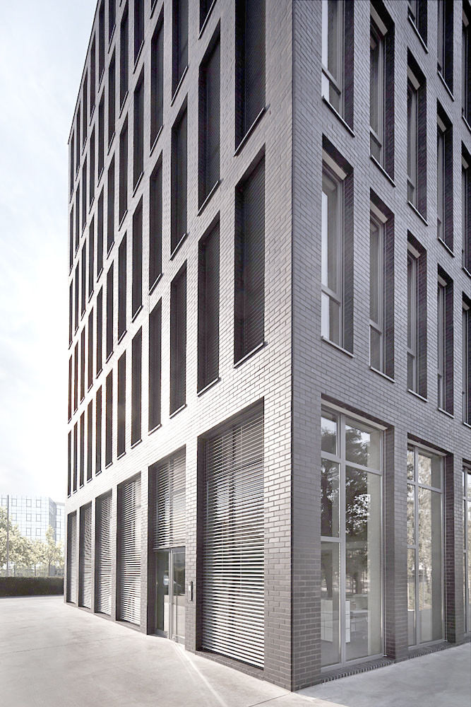 Das Gebäude hat einen quadratischen Grundriss mit einer Kantenlänge von 17 m. Die Fassade ist sowohl in der Höhe, als auch in der Breite konsequent gerastert und besteht ausschließlich aus Pfeilern und geschosshohen schmalen Fensterelementen. Auf Vor- oder Rücksprünge oder andere Gliederungselemente wurde bewusst verzichtet. Die im 6. Obergeschoss nach Westen eingeschnittene Dachterrasse im Wohngeschoss liegt hinter der ungestört durchlaufenden Fassadenstruktur. Lediglich das Erdgeschoss mit seiner Geschosshöhe von 5,75 m und dem Entfall jeder zweiten Fassadenstütze hebt den repräsentativen Charakter dieser Ebene hervor und differenziert die Höhenentwicklung des Gebäudes. Die handwerklich hergestellte Klinkerfassade aus quarzgebranntem Tonziegel harmoniert spannungsvoll mit der technischen Strenge und Kühle der Fassadenstruktur, und spiegelt so das Selbstverständnis des Unternehmens und des Investors wieder.