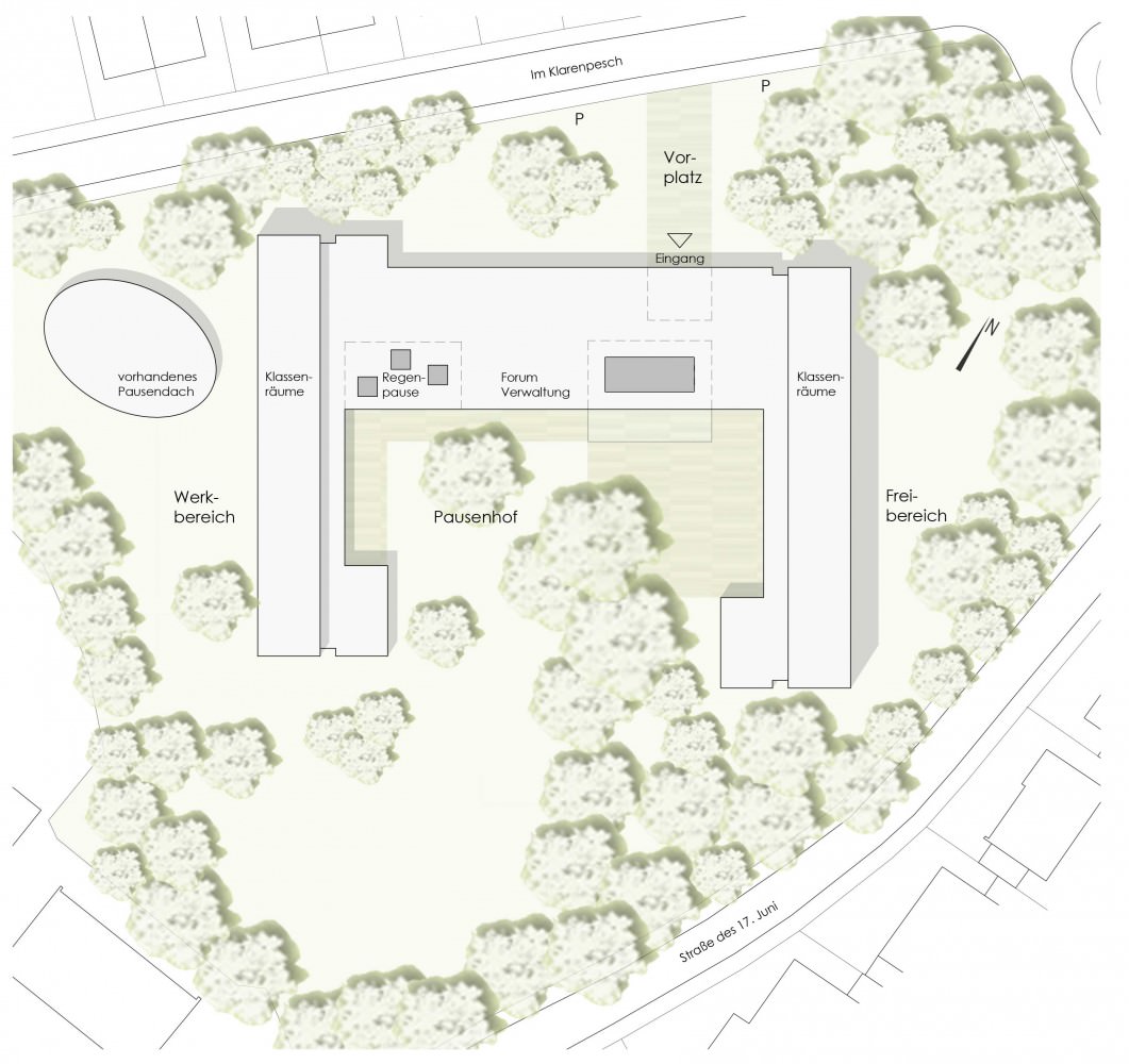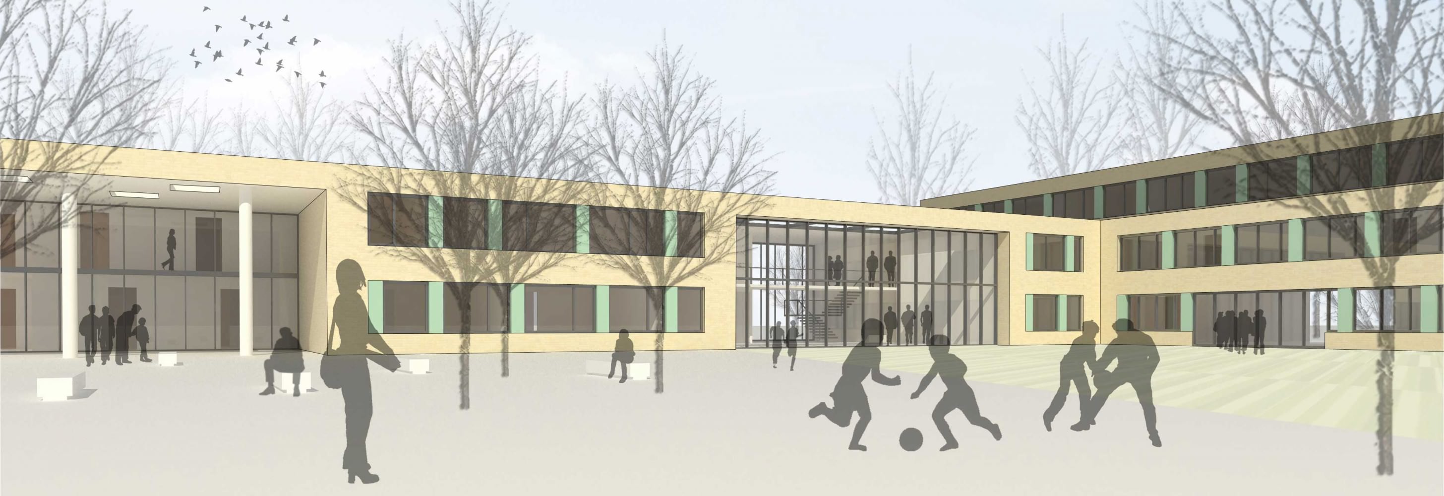 Ein differenziertes Freiflächenangebot ergänzt die Umbaumaßnahmen. Die Hoffläche zwischen den Baukörpern wird künftig klar gefasst und bildet den Mittelpunkt des Schulhofes mit direktem Bezug zu den drei Gebäudeteilen. Die großzügigen umgebenden Freiflächen mit ihrem prägenden Baumbestand werden nicht verändert.