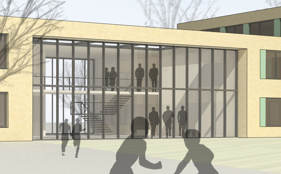 Vom Forum aus erschließen sich die in den Bestandsriegeln untergebrachten Klassentrakte. Alle zugehörigen Funktionen finden in den beiden Riegeln Platz.
