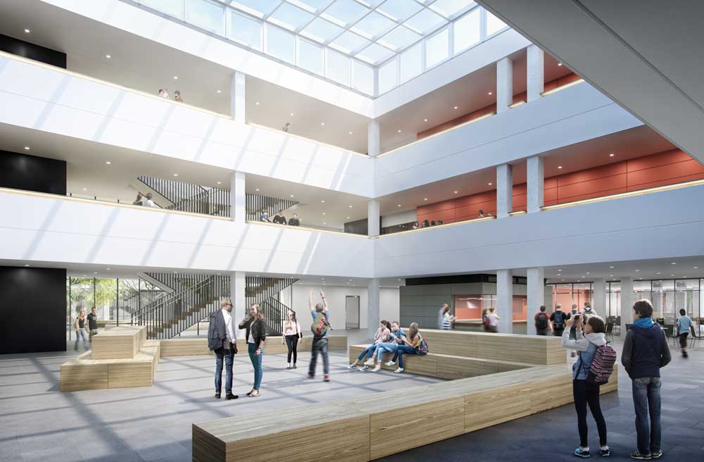 Um diesen Gedanken konsequent fortzuführen, wird der mittlere der drei Höfe als überdachter Innenraum in diesen Bereich einbezogen und bildet als Atrium mit offenen Galerien über alle Geschosse den neuen Mittelpunkt der Schule. Dieser zentrale Bereich führt zu einer offenen Gebäudestruktur, die eine einfache Orientierung mit kurzen Wegen auch bis in die Obergeschosse ermöglicht.