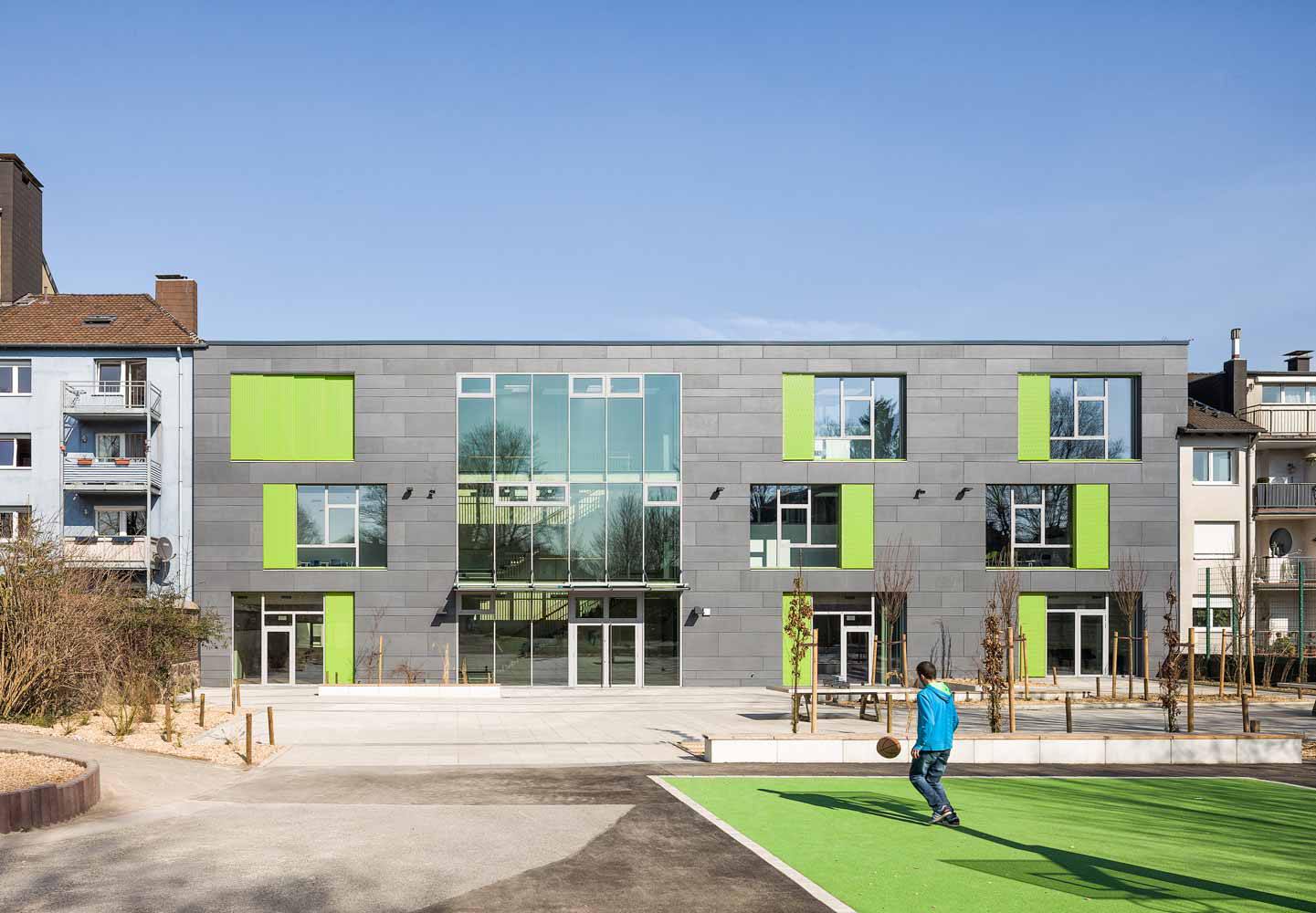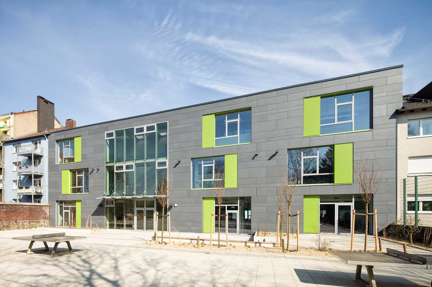 Der naturwissenschaftliche Trakt der Else-Lasker-Schüler-Gesamtschule an der Windstraße in Wuppertal wurde aufgrund von Schadstoffbelastungen und statischen Problemen abgerissen und an gleicher Stelle in Passivhausbauweise neu errichtet. Der Neubau fügt sich in das Straßenbild ein und nimmt die Flucht der Nachbarbebauung auf. Es wurde ein kompakter Baukörper mit optimierter Hüllfläche gewählt, der in drei Geschossen das vorgegebene Raumprogramm umsetzt. Das Gebäude wurde mit einer Brutto-Geschossfläche von ca. 1.600 m² als Massivbau mit vorgehängter Fassade aus zementgebundenen Platten ausgeführt. Der wertig gestaltete zentrale Treppenraum wird von den Schülern als Ort für Begegnung und Kommunikation genutzt und zeichnet sich durch eine dreigeschossige Pfosten-Riegel-Verglasung aus. Die Fachräume werden meist von zwei Seiten natürlich belichtet, die Vorbereitungs- und Sammlungsräume sind diesen direkt zugeordnet. Da ein bestehender Transformatorenraum der Wuppertaler Stadtwerke im Untergeschoss des Bestandsgebäudes bestehen bleiben musste, wurde der Keller in Teilen erhalten und der Neubau hierauf aufgesetzt.
