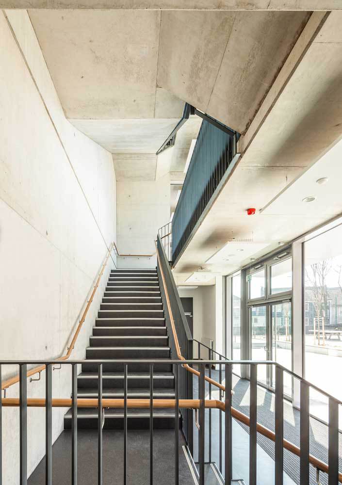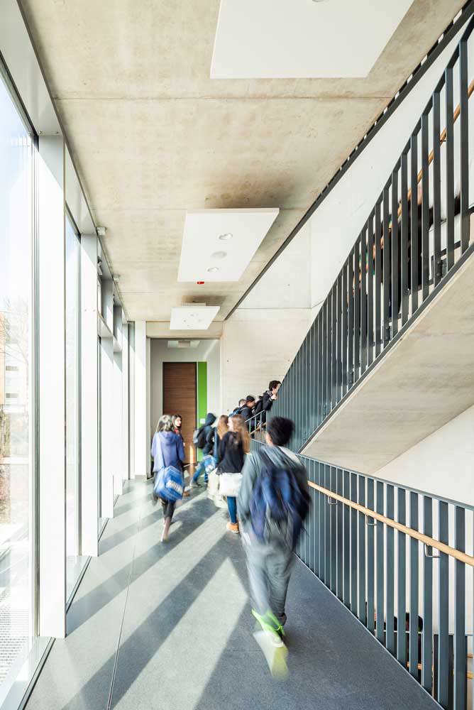 Die Haupterschließungsfläche dient als Pufferzone gegen sommerliche Überhitzung und deren massive Wände als Speicher mit hoher thermischer Speicherkapazität. Zur Ausnutzung solarer Gewinne sind an der schulhofseitigen Südwest-Fassade große Fensterflächen angeordnet. Der sommerliche Wärmeschutz wird durch zentral gesteuerte, Motor betriebene außenliegende Schiebeläden sichergestellt. Zur Versorgung des Gebäudes mit Frischluft und zur Vermeidung eines CO2-Anstieges kommt eine kontrollierte Lüftungsanlage mit Wärmerückgewinnung zum Einsatz.