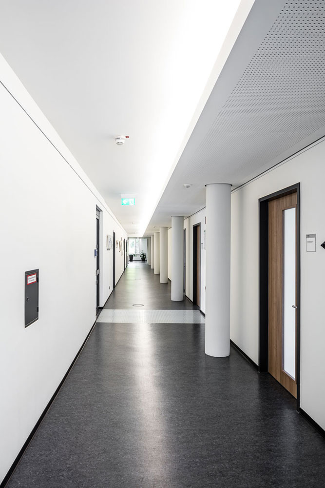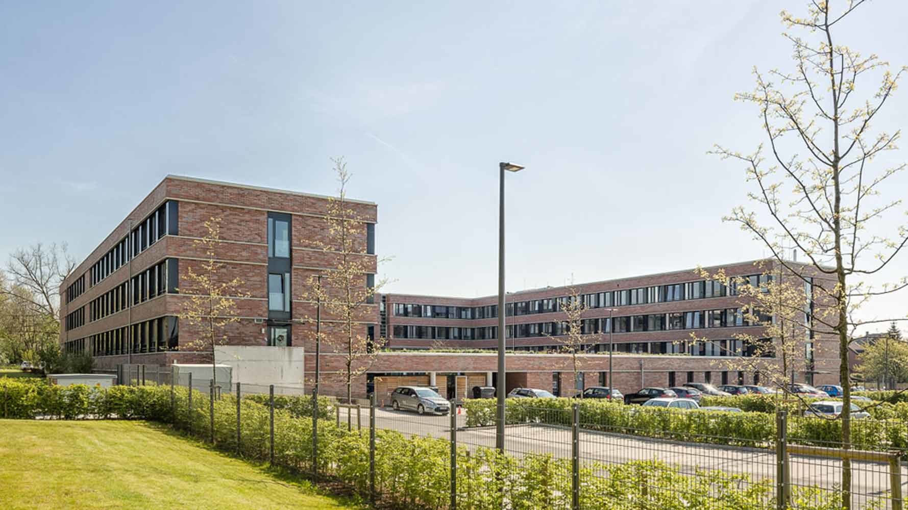 Das Flachdach des Küchen-/Kantinengebäudes ist entsprechend des B-Plans intensiv begrünt. Die Fassade ist als Bandfassade geplant. Klinkerstreifen wechseln sich mit Glasstreifen ab. Der Haupteingang ist hell und offen mit einer Alu-Pfosten-Riegel-Konstruktion 2-geschossig geplant.