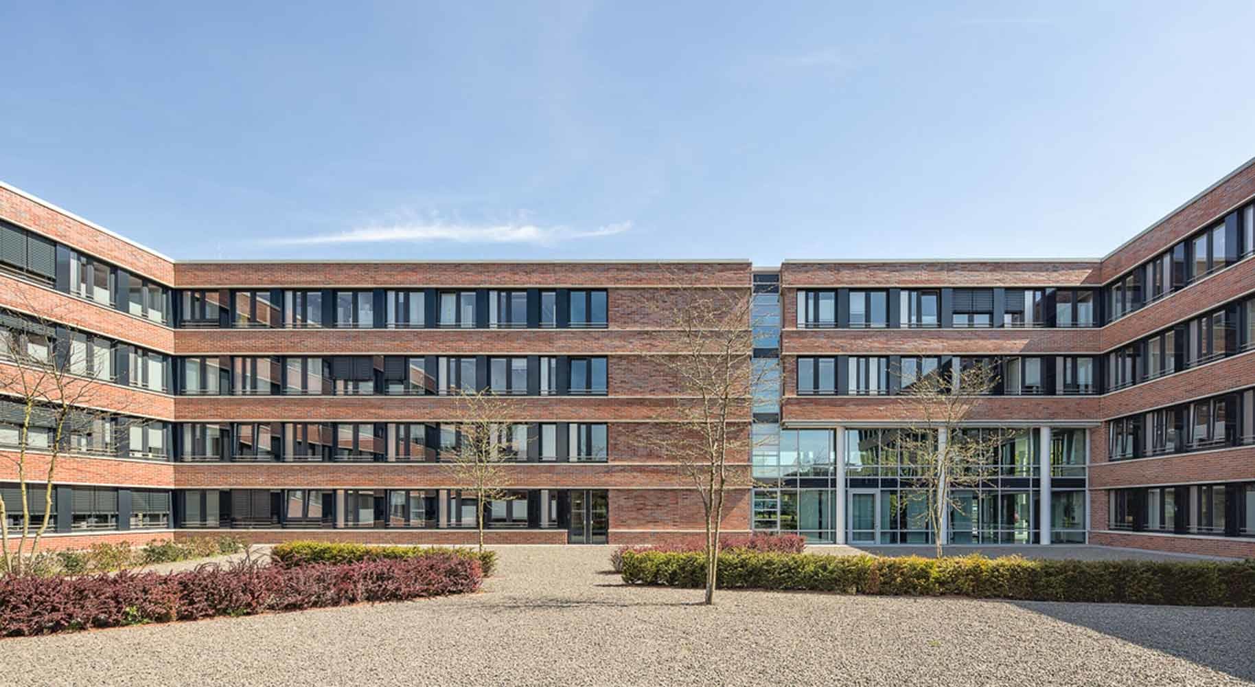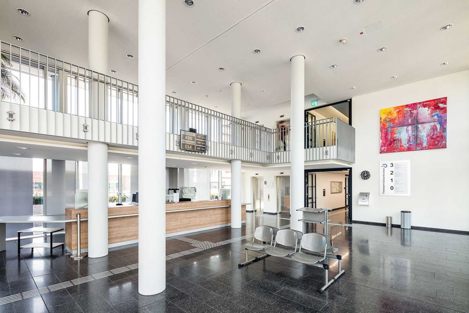 Das 4-geschossige Verwaltungsgebäude gruppiert sich U-förmig um einen geschützten Innenhof, des südwestlich durch ein eingeschossiges Gebäude, in dem sich im Wesentlichen die Kantine und die Küche befindet, geschlossen wird.Aufgrund der Gefällesituation des Grundstückes schiebt sich das Gebäude in den Hang hinein. Ein Teil des Gebäudes entlang der Emil-Zimmermann-Allee und der Ludwig-Erhard-Straße hat somit einseitig keine Belichtung. In diesen Bereichen befinden sich die Archivflächen. Der Haupteingang befindet sich – bereits im B-Plan angedacht – an einem Kreisverkehr in der östlichen Ecke des Grundstückes. Hier erreicht man über eine Karusselltür das Foyer mit Infotheke und Wartezone. Unmittelbar angrenzend gelegen sind ein Duplexaufzug und das Haupttreppenhaus. Für die weitere Erschließung gibt es zusätzlich zwei Treppenhäuser. Im Gebäude befinden sich im Wesentlichen Büros, einige Besprechungsräume, Teeküchen, WC-Anlagen und eine Hausmeisterwohnung im 1. Obergeschoss.