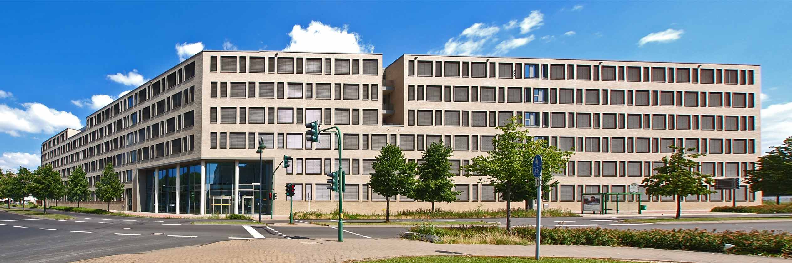 Der Hauptzugang liegt an zentraler Stelle des Baukörpers gegenüber des Horst-Henning-Platzes. Der Empfangsbereich mit seiner großzügigen Fassadenöffnung und seinem Innenraum über 2 Geschosse gewährleistet eine optimale Haupterschließung in Gebäudemitte.