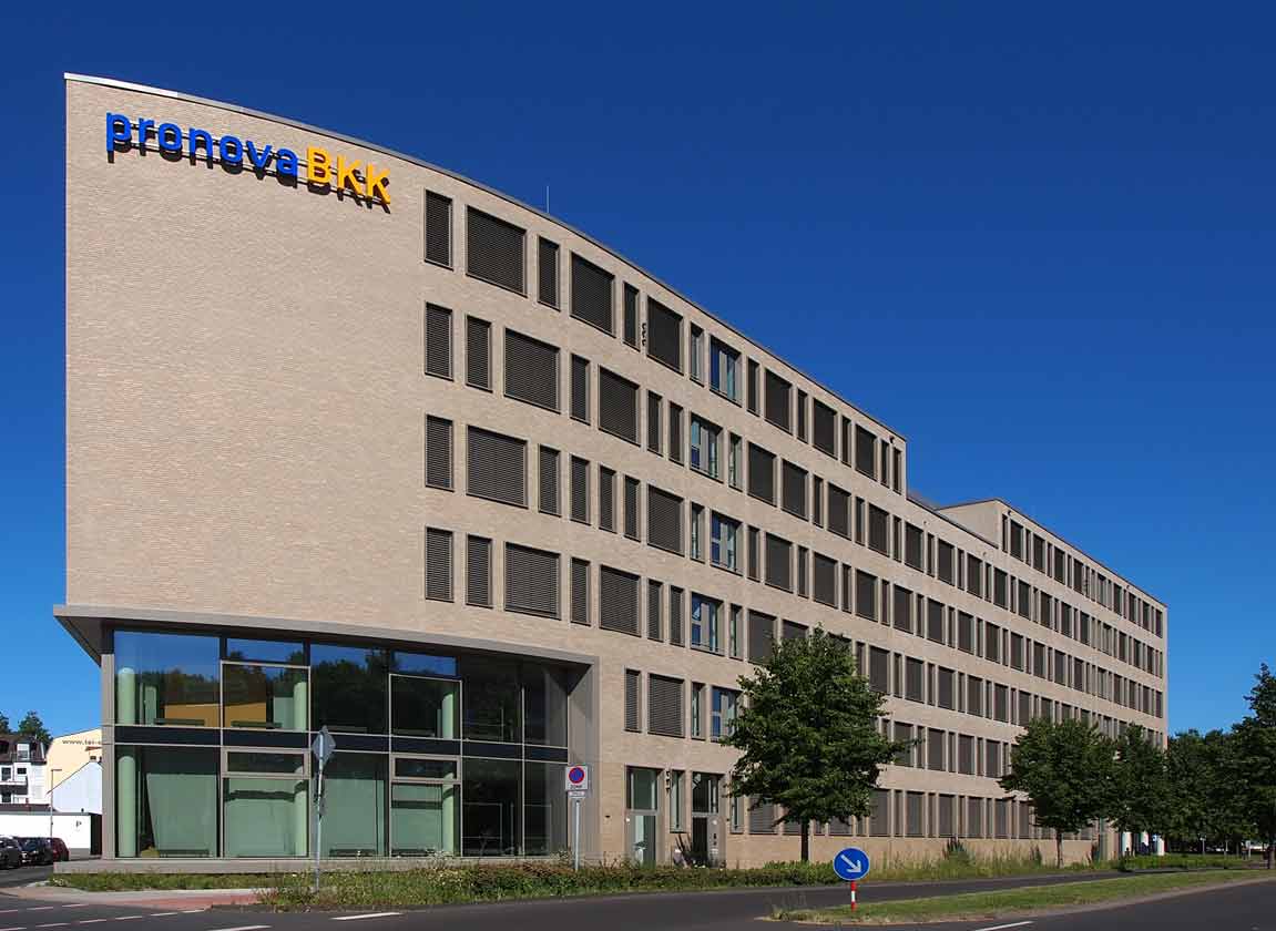 Die Fassade wird als Wärmedämmverbundsystem mit Klinkerriemchen ausgeführt. Die Fensteröffnungen werden mit Aluminium-Zargen eingefasst. Diese Zargen sowie die opaken Lüftungsflügel für die Nachtlüftung ermöglichen eine farbliche Gestaltung und Differenzierung der Gesamtfassade. Die zweigeschossige Glasfassade im Bereich des Haupteingangs und die großformatige Öffnung im Bereich der Konferenz- und Schulungsräume im westlichen Gebäudeflügel unterbrechen das ansonsten regelmäßige Fassadenbild. Die Wirkung der Gebäudespitze an der Lichstraße/Peschstraße wird durch die Abrundung der straßenseitigen Fassadenfront und einem Logo-Schriftzug der pronova BKK unterstrichen. Zwei großformatige Einschnitte für Dachterrassen und Balkone differenzieren zusätzlich das straßenseitige Fassadenbild. Die Mitarbeiter erhalten zudem in den Obergeschossen die Möglichkeit einer kurzen Pause an frischer Luft.