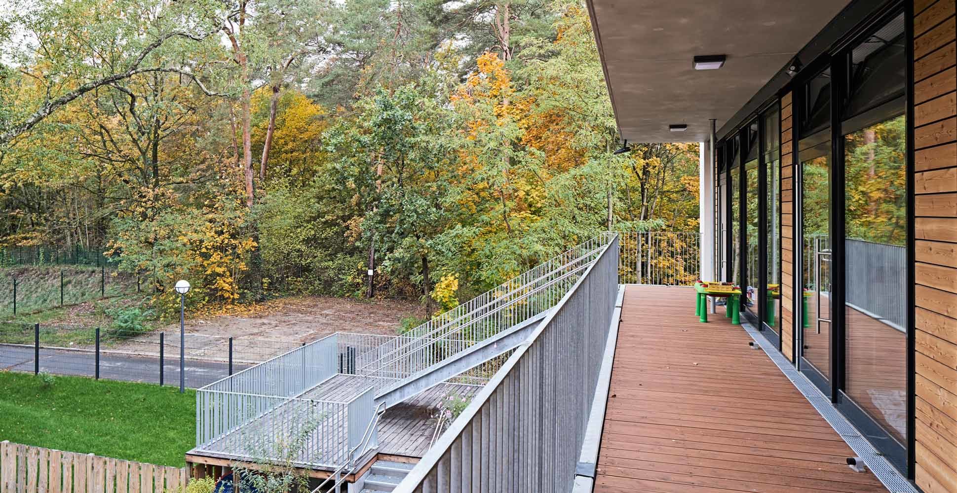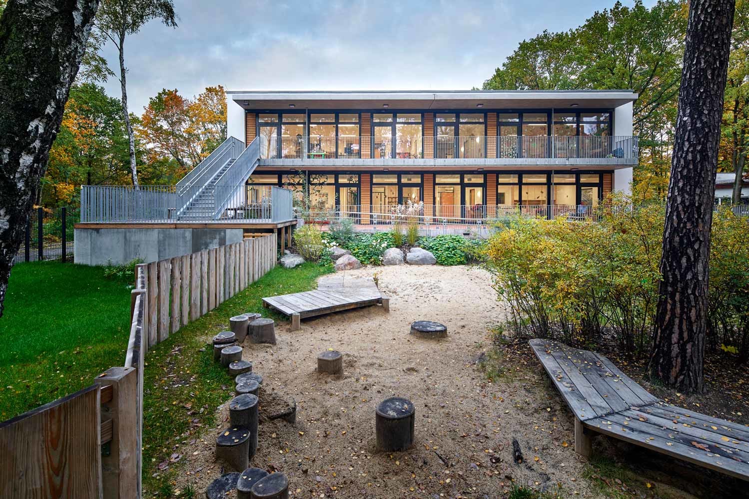 Als pädagogische Ergänzung einer bestehenden Schule und direkt auf dem Waldgelände des Schulgrundstücks entstand der Neubau einer 5-gruppigen Kita für 100 Kinder. Die Lage im Wald und die Nähe zur bestehenden Schule prägen das Konzept und die pädagogische Ausrichtung der Kita.