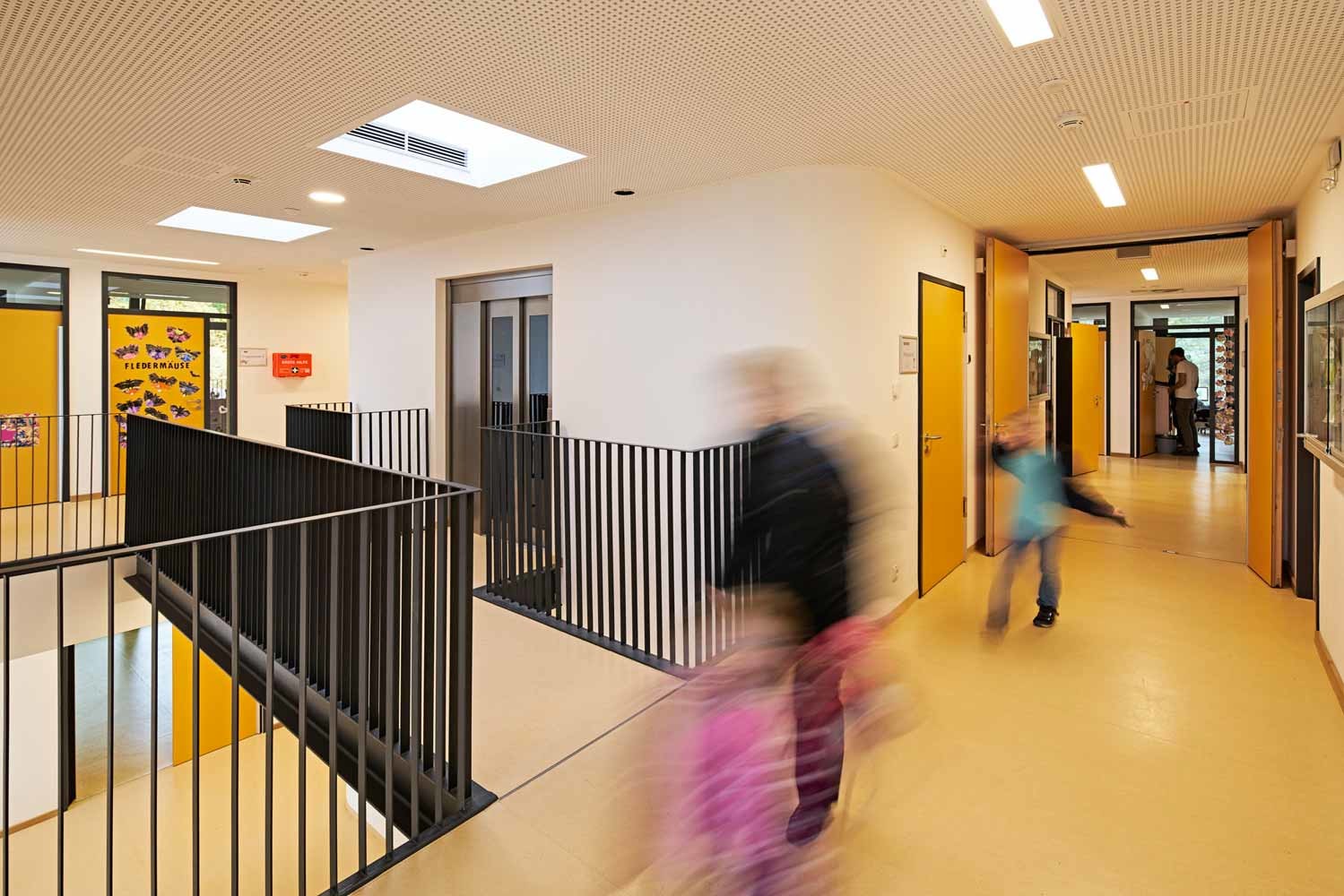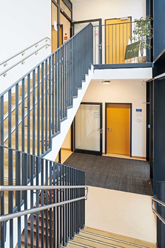 Erschlossen wird die Kita über ein großes, zentrales Treppenhaus, das eine optische Verbindung der beiden Etagen sicherstellt. Alle Fluchtwege der Gruppenräume führen direkt ins Freie. Brandabschottungen konnten auf ein Mindestmaß reduziert werden und sind im täglichen Gebrauch nicht spürbar.