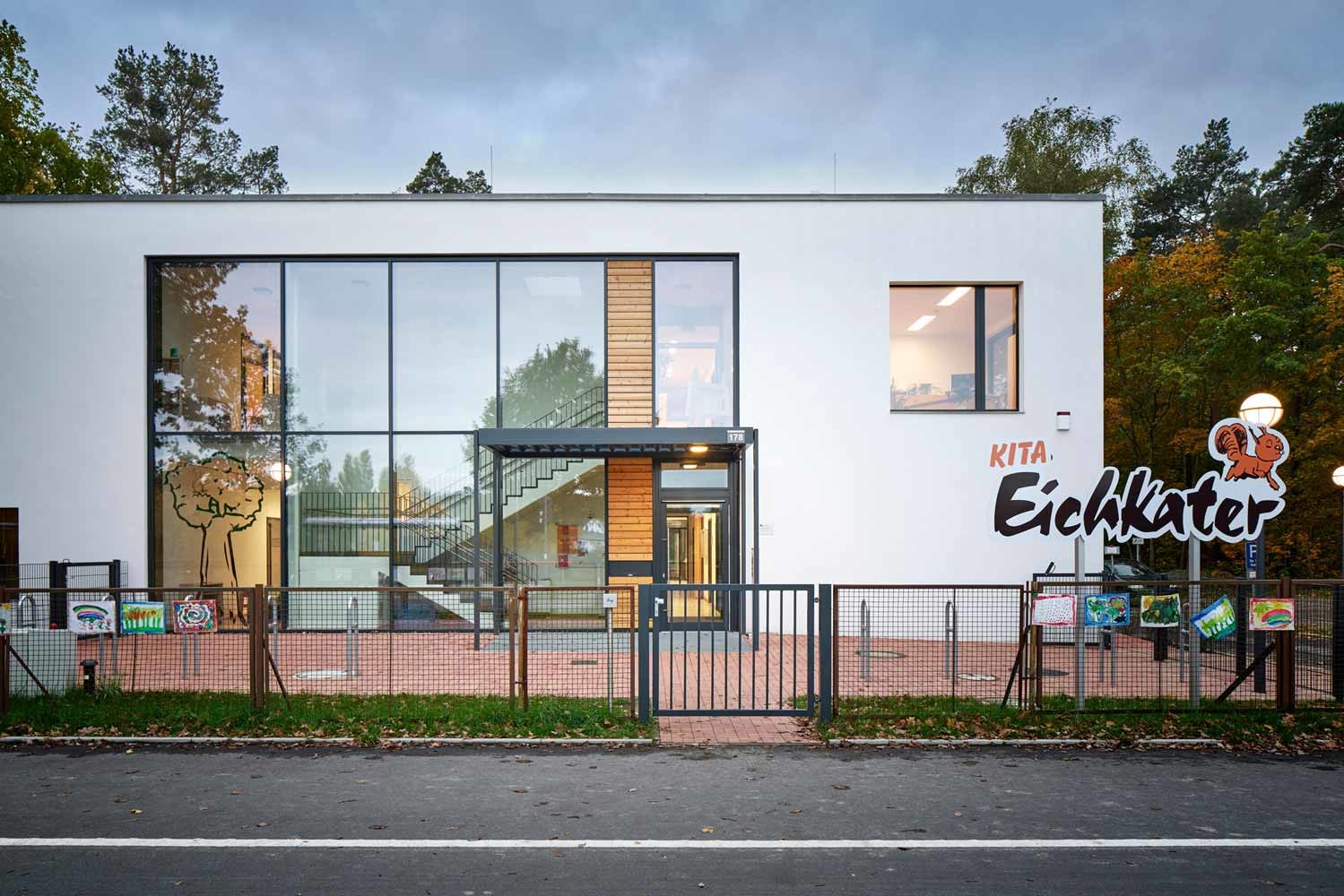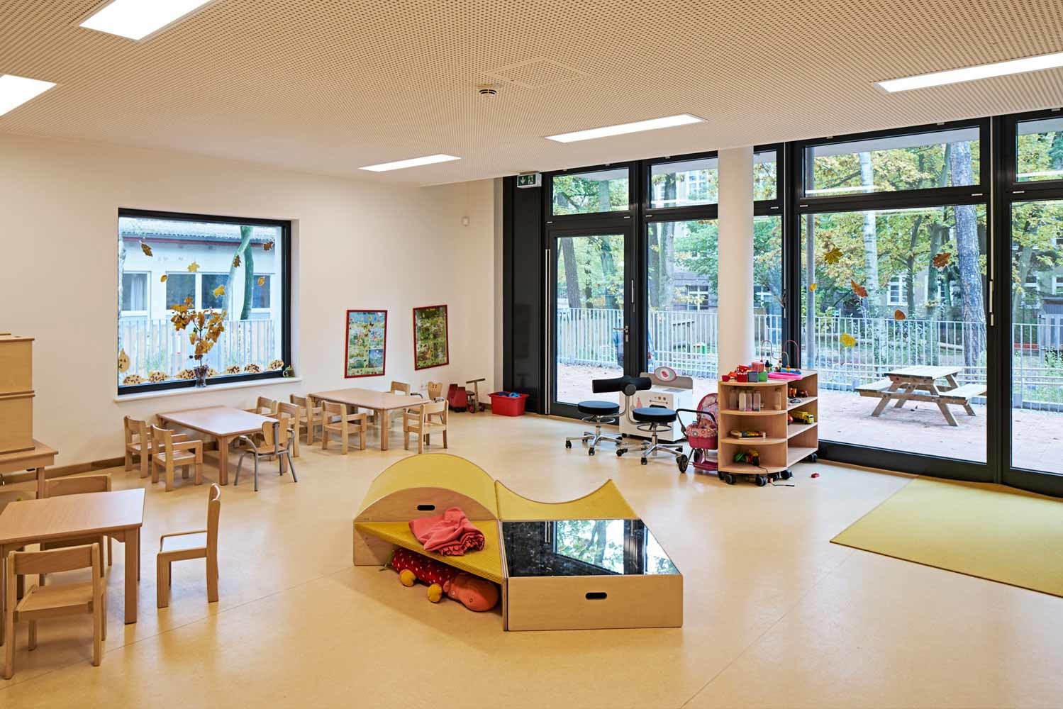 Neubau einer behindertengerechten Kindertagesstätte mit 5 Gruppen im GreenBuilding-Standard für einen gemeinnützigen Träger in Berlin-Rahnsdorf.