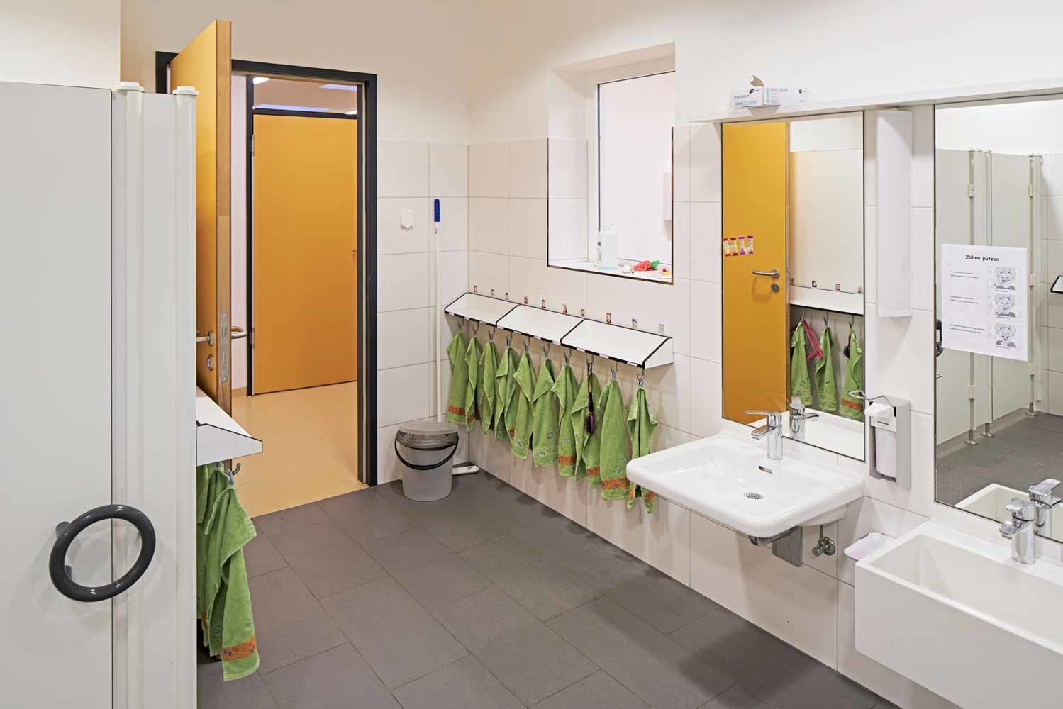 Der zweigeschossige Baukörper beherbergt 5 Kitagruppen mit Neben-räumen, Sport- und Förderräumen sowie eine Vollküche, die die Kita täglich mit warmen Mahlzeiten versorgt.
