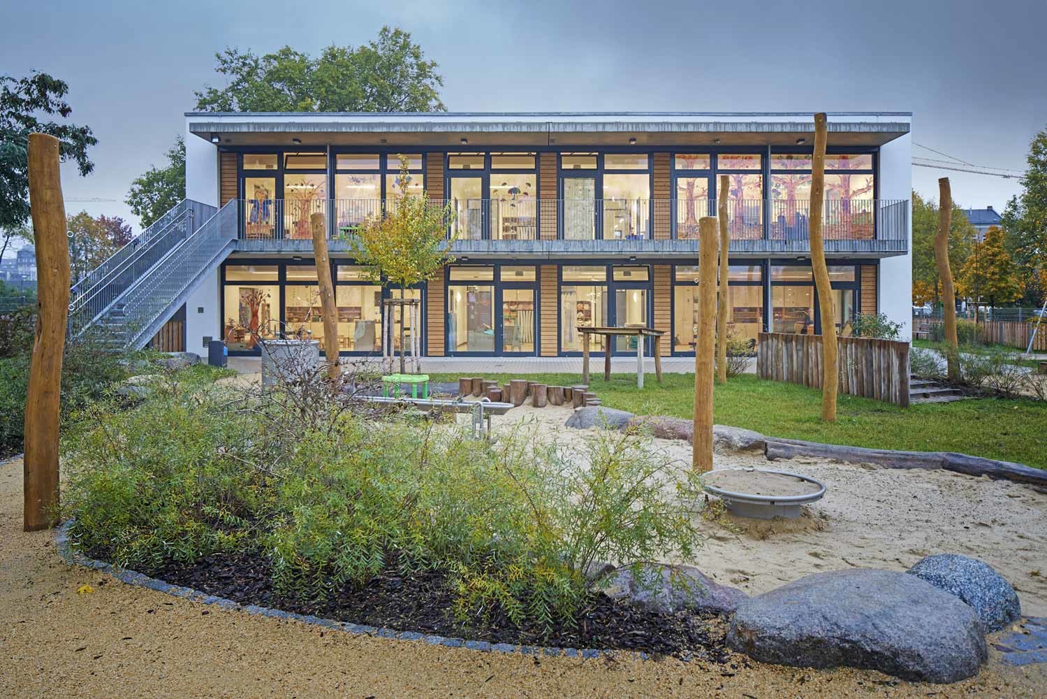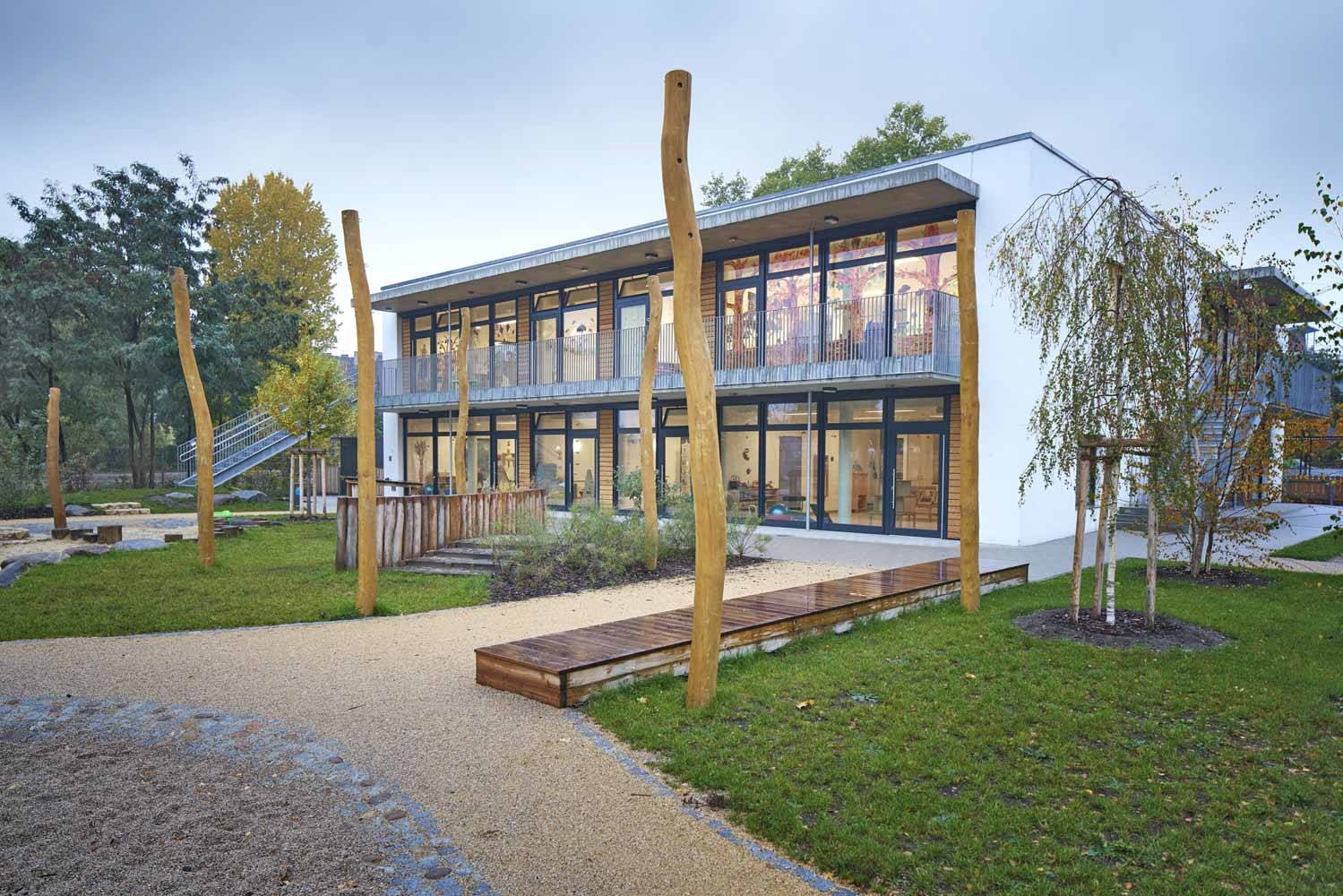 Der zweigeschossige Baukörper beherbergt 5 Kitagruppen mit Neben-räumen, Sport- und Förderräumen sowie eine Vollküche, die die Kita täglich mit warmen Mahlzeiten versorgt.