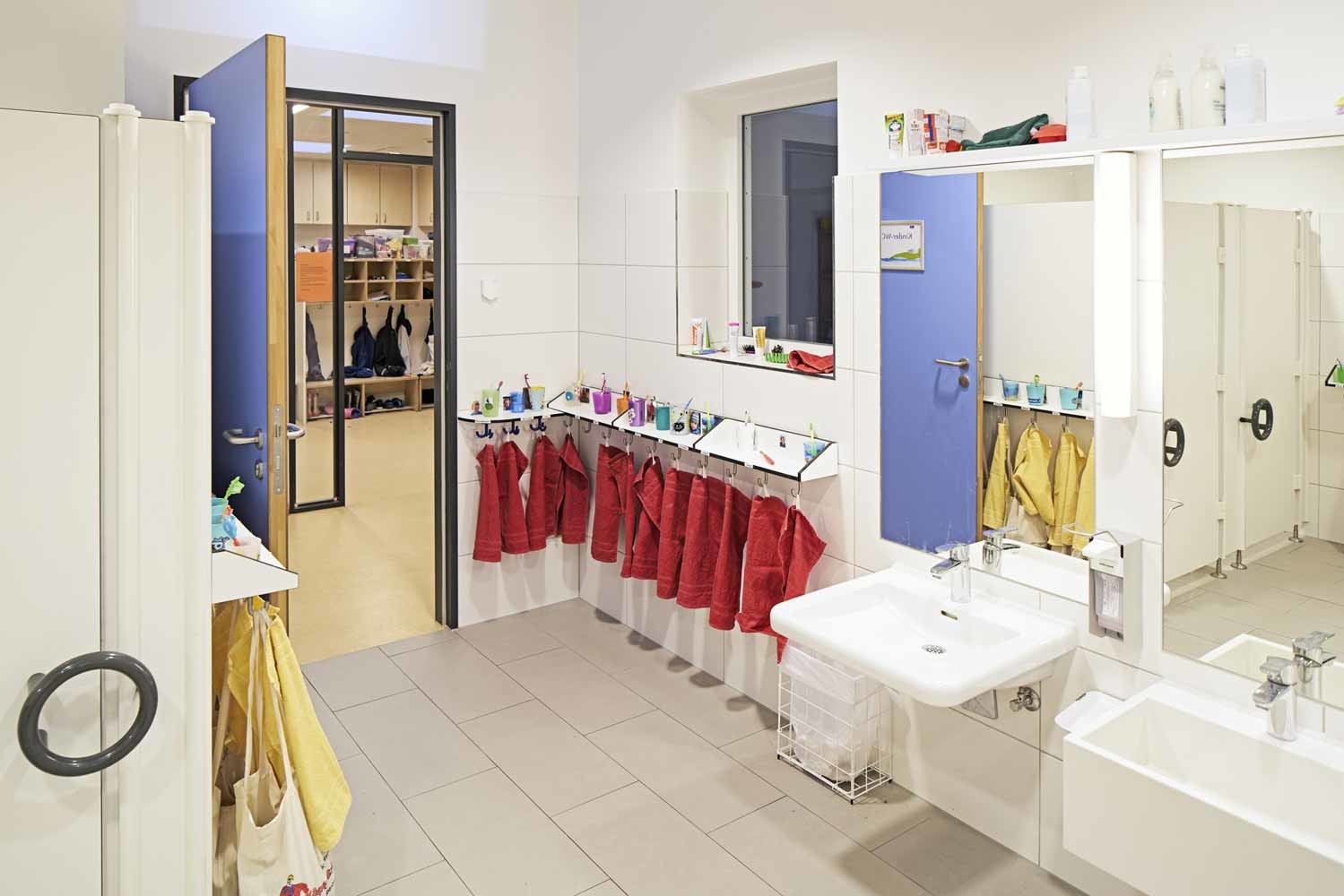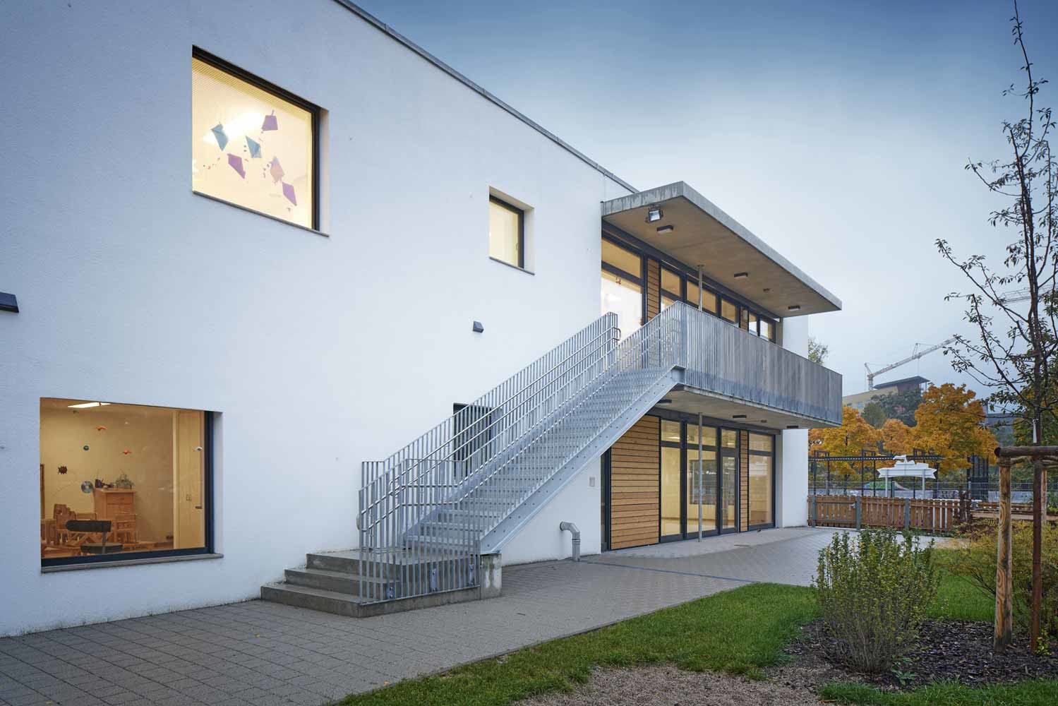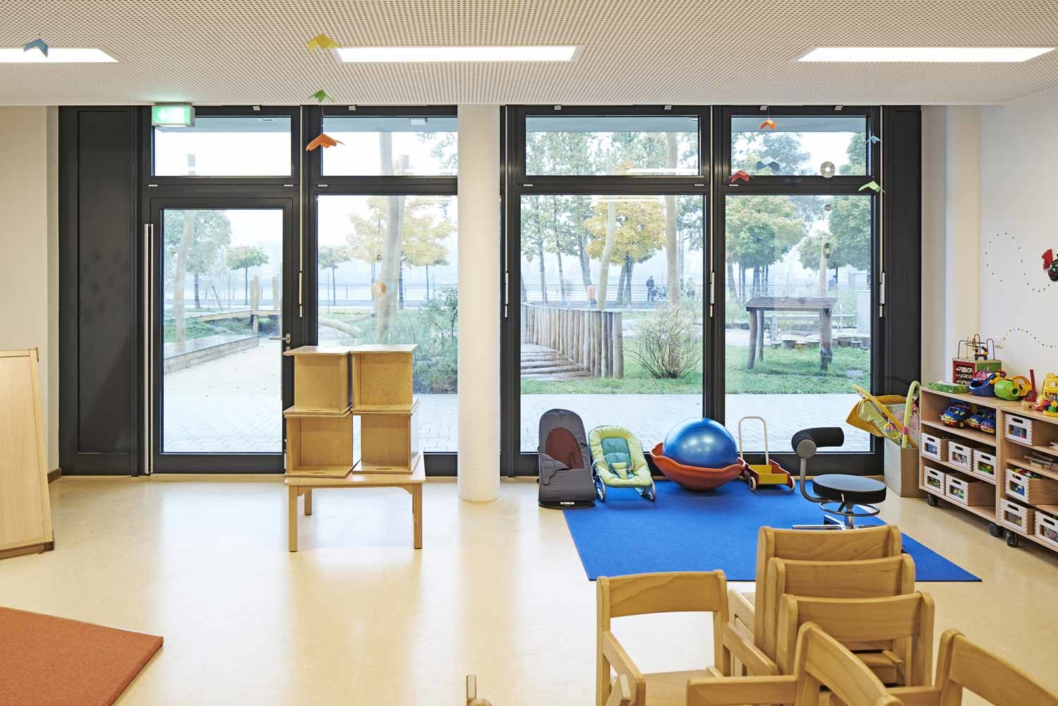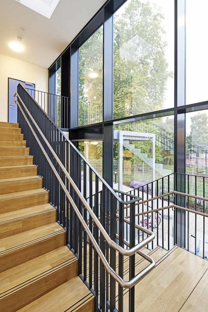 Erschlossen wird die Kita über ein großes, zentrales Treppenhaus, das eine optische Verbindung der beiden Etagen sicherstellt. Alle Fluchtwege der Gruppenräume führen direkt ins Freie. Brandabschottungen konnten auf ein Mindestmaß reduziert werden und sind im täglichen Gebrauch nicht spürbar.