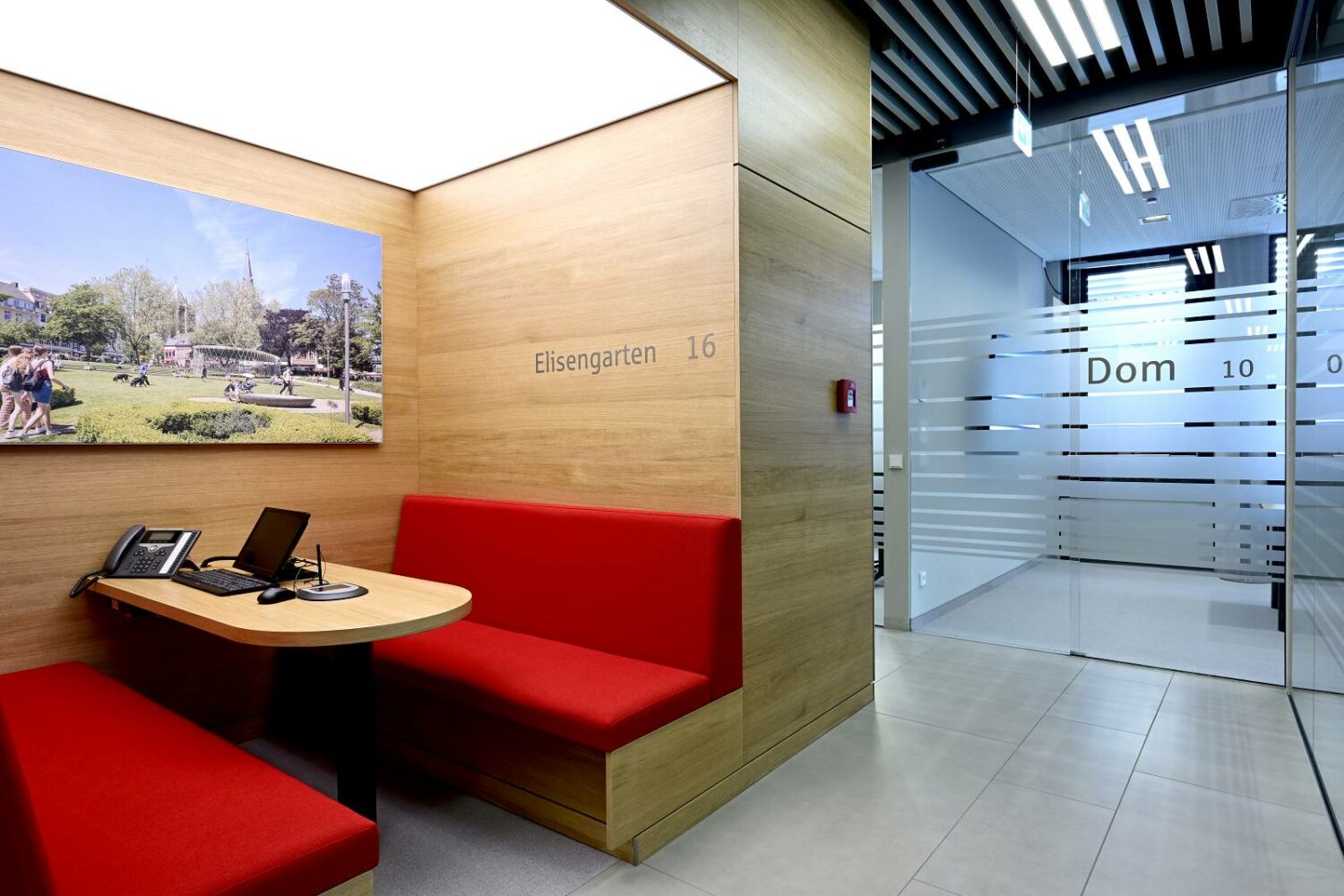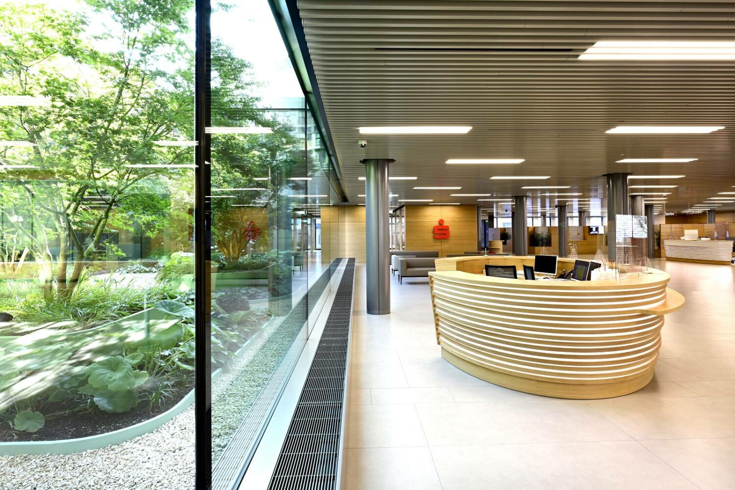 Der Besucher betritt die Räumlichkeiten über den SB-Bereich mit Geldautomaten und Banking-Terminals und gelangt so in die offene Kundenhalle mit Blick auf die zentrale Infotheke, den Servicetheken und der Kassenzone. Im Hintergrund schaut man dabei auf die üppig begrünten Lichthöfe, die den Mitarbeiter*innen einen hellen, hochwertigen Arbeitsplatz mit Tageslicht bieten. Im rückwärtigen Bereich der Halle gelangt man zu den individuellen Beratungsbereichen mit Sitzlandschaften zum Warten und Verweilen. Der Kundentresor befindet sich im Untergeschoss des Gebäudes.
