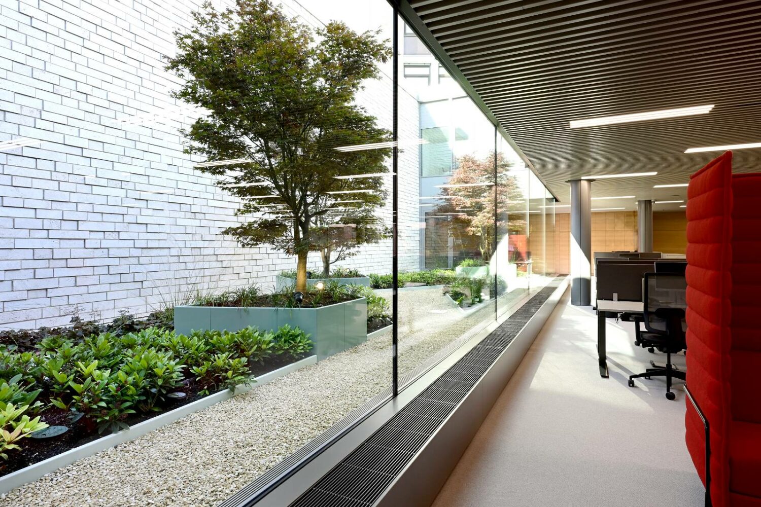 Die Büros der Mitarbeiter im Obergeschoss werden ebenfalls über die vollständig verglasten, begrünten Innenhöfe, die sich über zwei Geschosse erstrecken, mit dem nötigen Tageslicht und natürlicher Belüftung versorgt. Die betriebseigene Kantine verfügt zudem über eine hochwertige Außenterrasse.