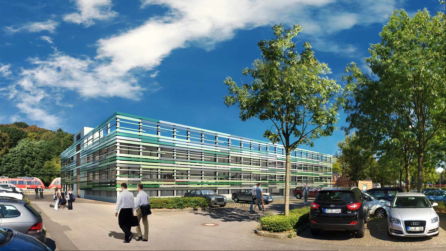 P+R-Parkhaus am Hauptbahnhof Stolberg zur Deckung des erhöhten Bedarfes an Stellplätzen für Pendler und zur Steigerung der Attraktivität des öffentlichen Personenverkehrs.