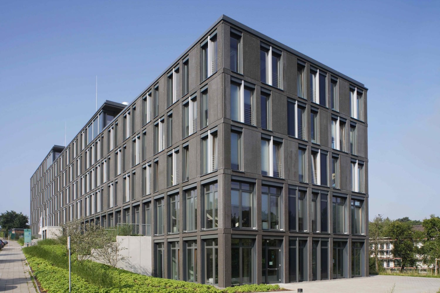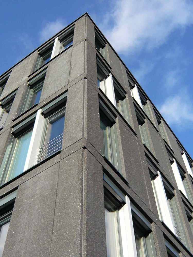 Die Fassade ist als Fertigteil-Sandwichfassade mit einem Grundmodul von 4,80 m Breite entwickelt worden. Die Vorsatzfassade wurde aus schwarz durchgefärbtem, sandgestrahlten Sichtbeton erstellt.