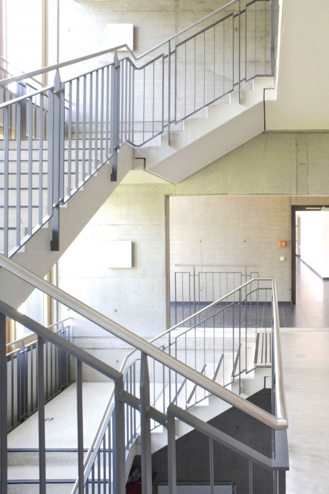 Durch die Typologie der Großraumbüros und durch die bodentiefen Fensteranlagen ergeben sich helle, großzügige und freundliche Arbeitsplätze. Die frei unter der Decke hängenden Deckensegel sorgen für eine angenehme Raumakustik. Das helle Kiefern-Nadelholz der Alu-Holz-Fenster und der Innentüren gibt den Räumen Atmosphäre und Wärme. Technische Installationen sind auf das Gebäuderaster abgestimmt und frei sichtbar, dies verleiht den Räumen einen Werkstattcharakter.